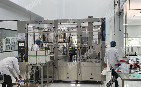 - Electromagnetic Flow meter based filling system with specialized end shut off zero dripping nozzles which gradually fills cubitainer bag from bottom.
